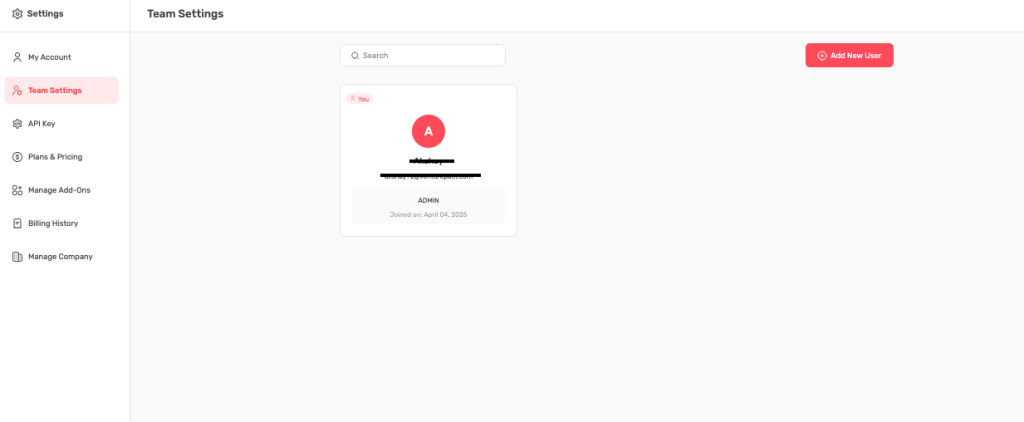 - Add New User Button: Prominent red button positioned for easy access to invite new members